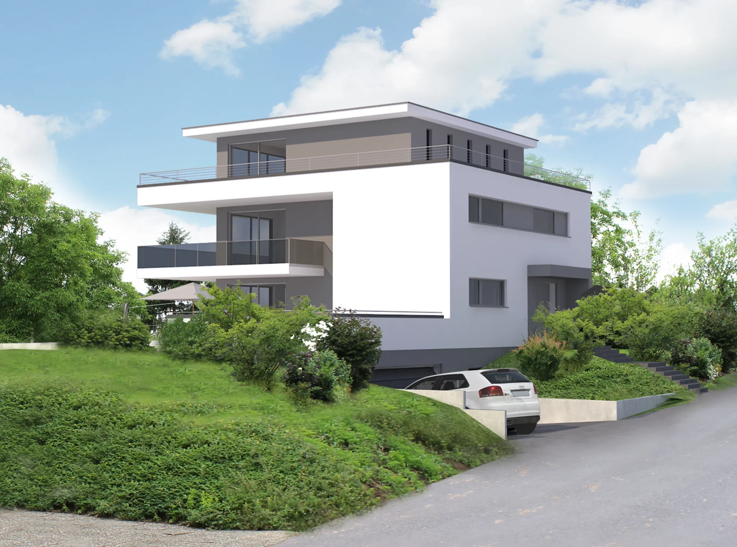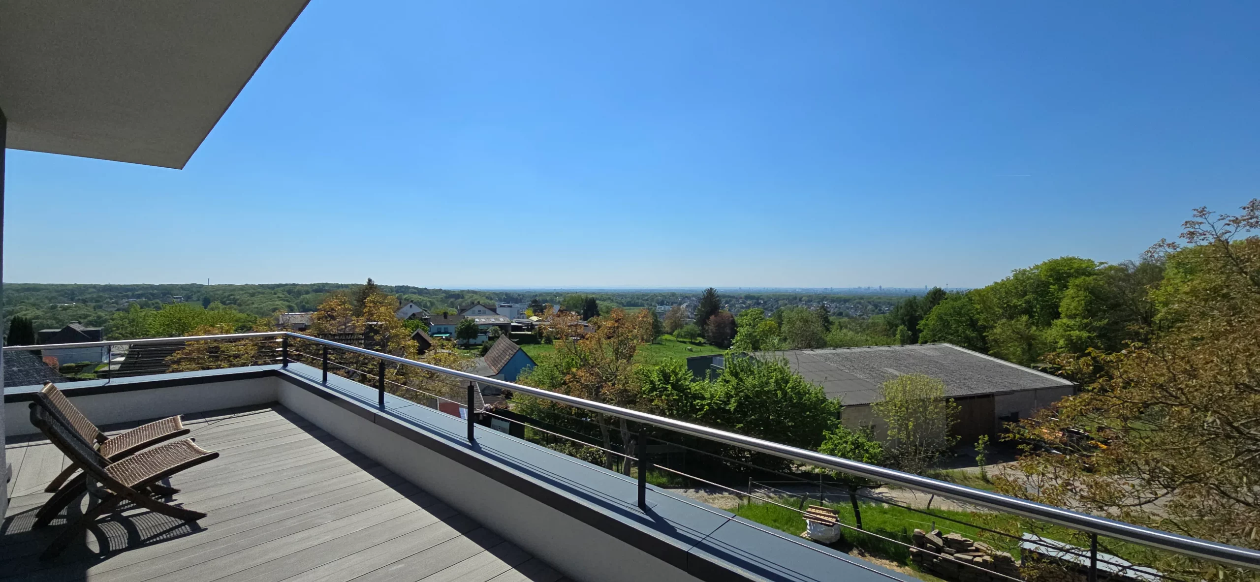 Das Wohnhaus öffnet sich nach Süden und Westen und ermöglicht von mehreren Geschossebenen aus den Fernblick auf die Kölner Bucht.